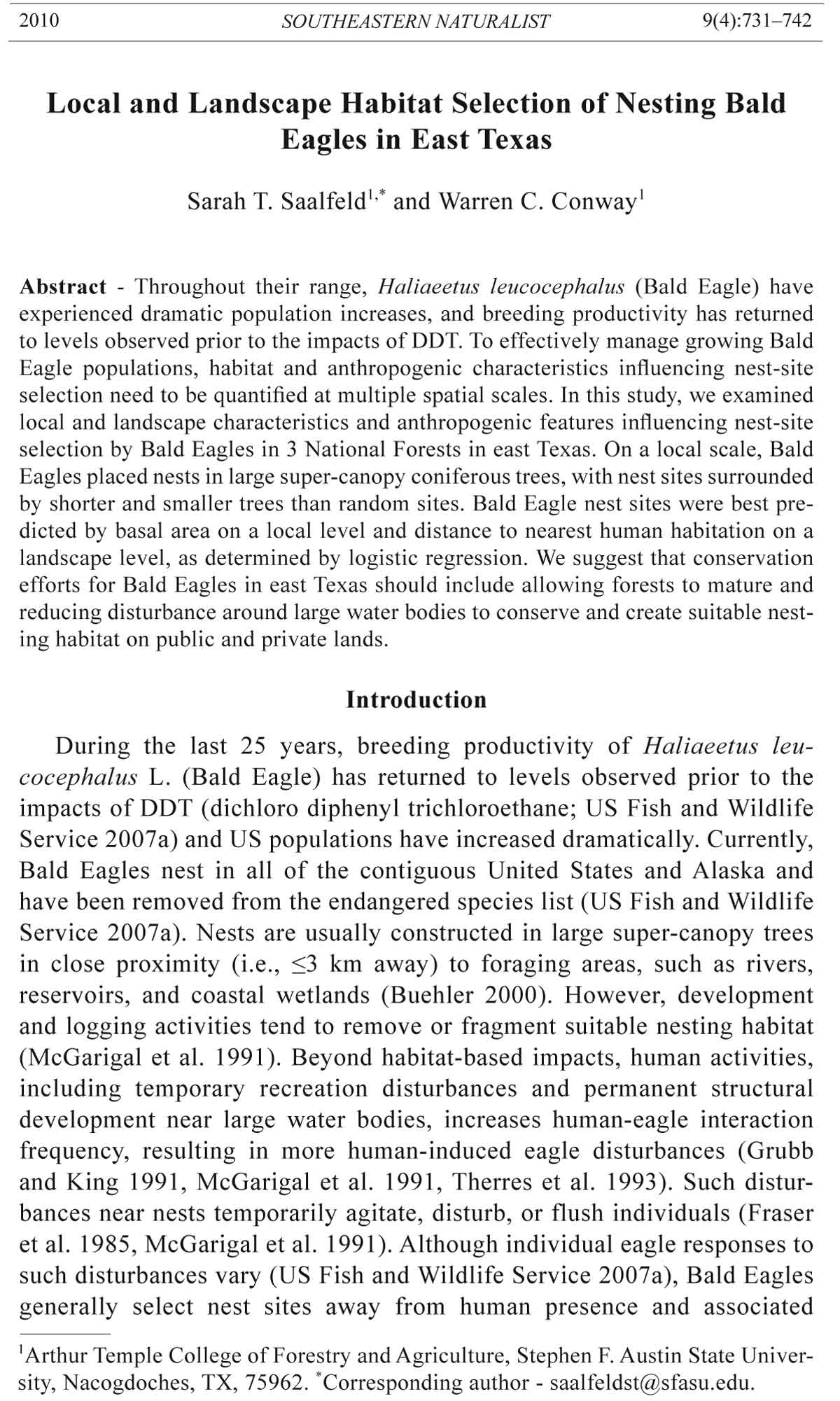 selection by Bald Eagles in 3 National Forests in east Texas. On a local scale, Bald