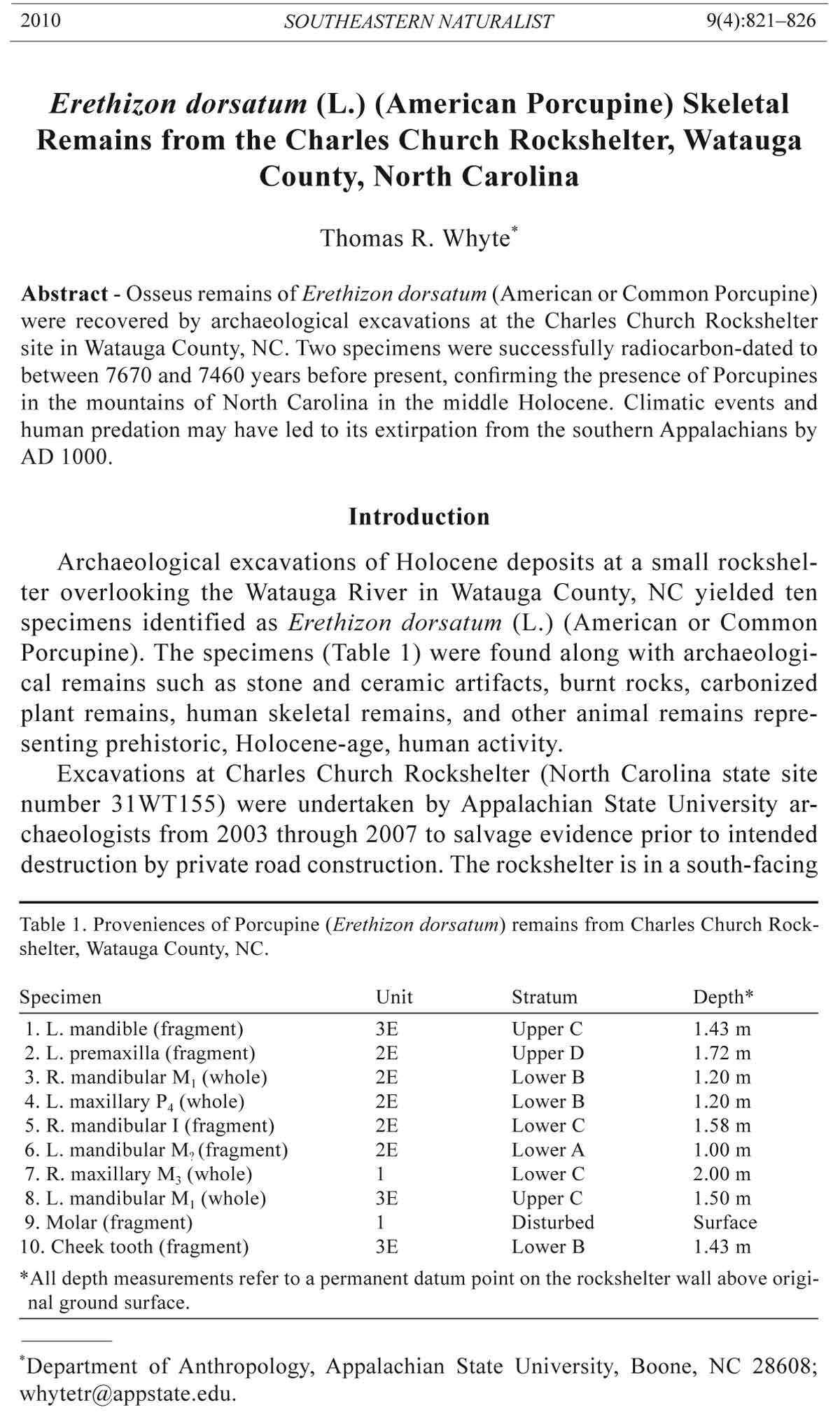 Table 1. Proveniences of Porcupine (Erethizon dorsatum) remains from Charles Church Rockshelter,