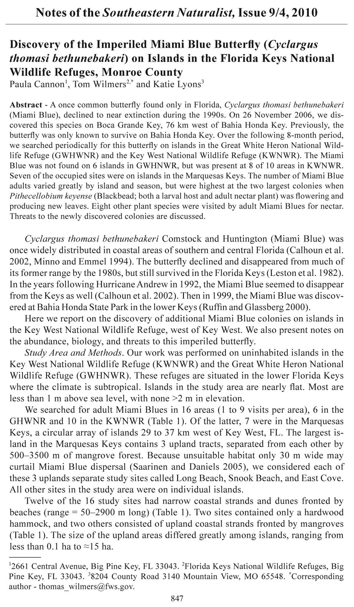 from the Keys as well (Calhoun et al. 2002). Then in 1999, the Miami Blue was discovered