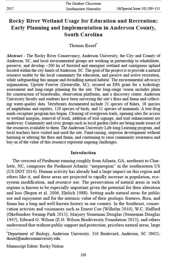 *Department of Biology, Anderson University, 316 Boulevard, Anderson, SC 29621;