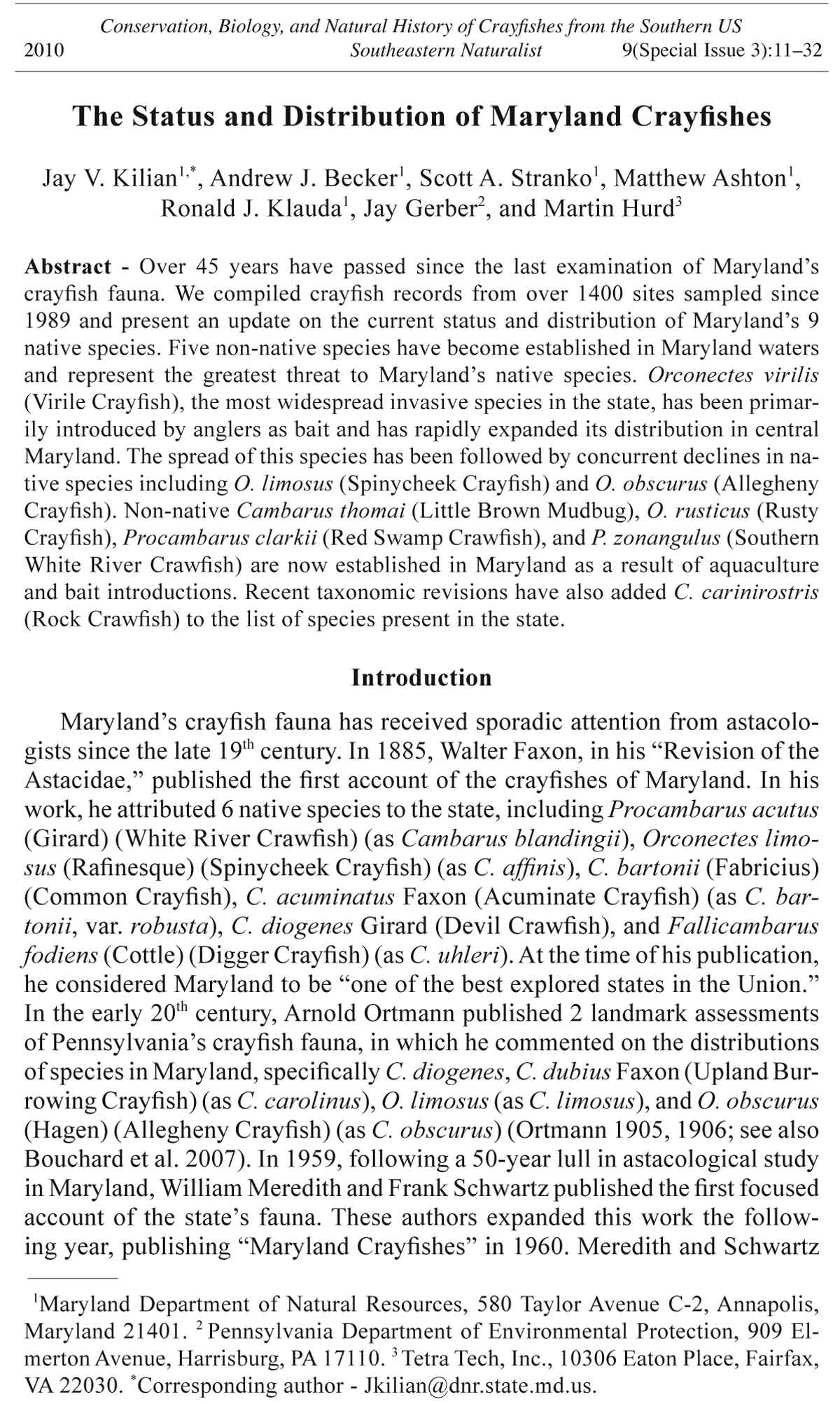 Maryland’s native crayfish fauna, bringing the state total to 9. Introductions