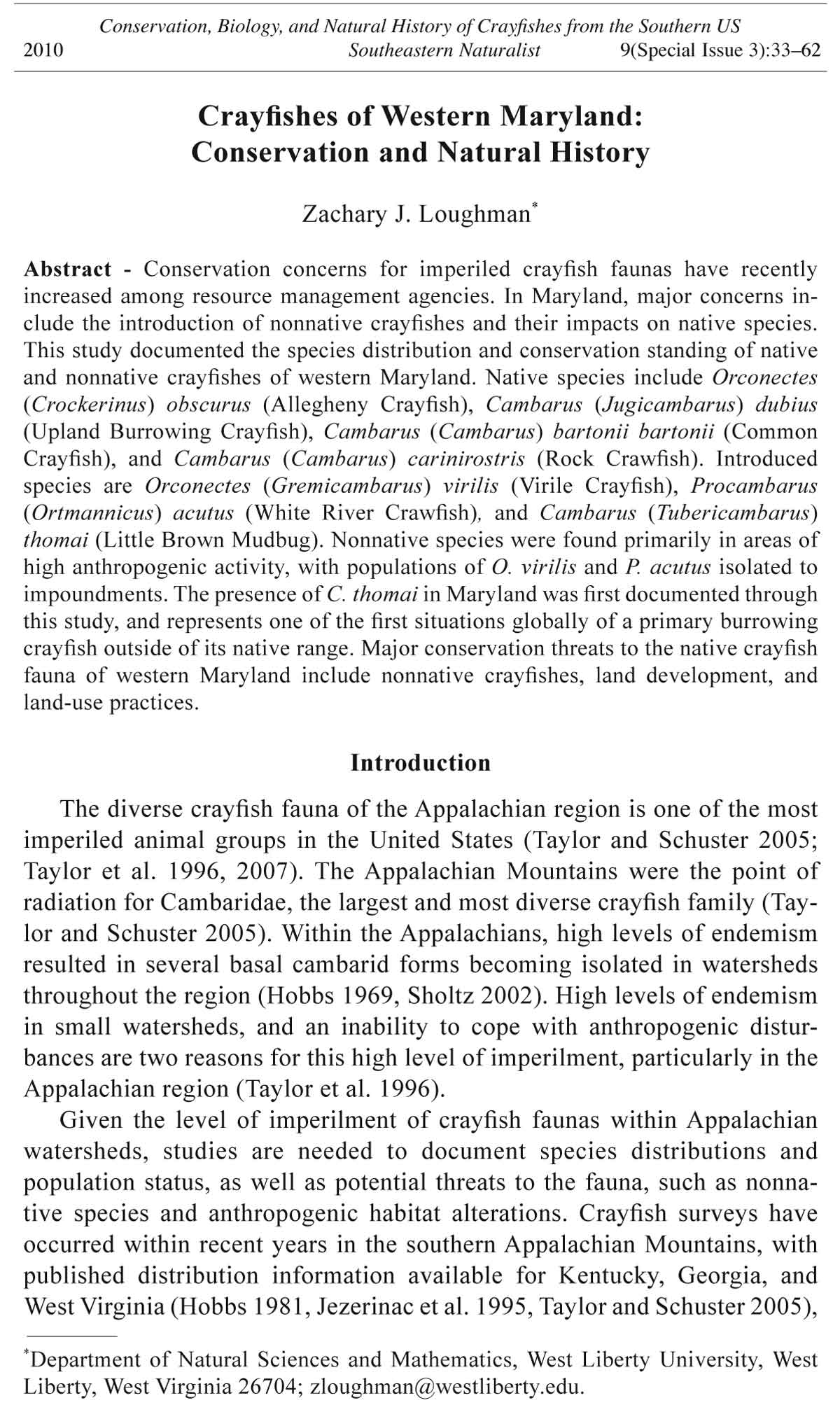 Loughman, Z.J. 2007. Cambarus thomai in Maryland: Conservation implications