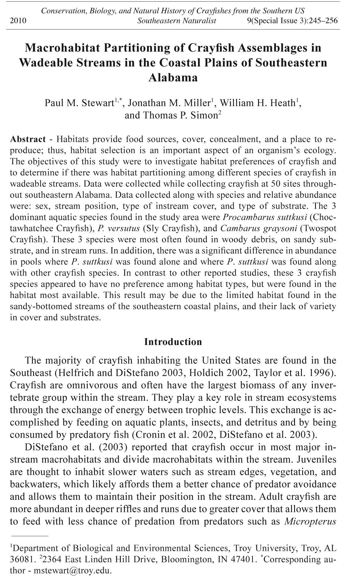 The objectives of this study were to investigate habitat preferences of crayfish and