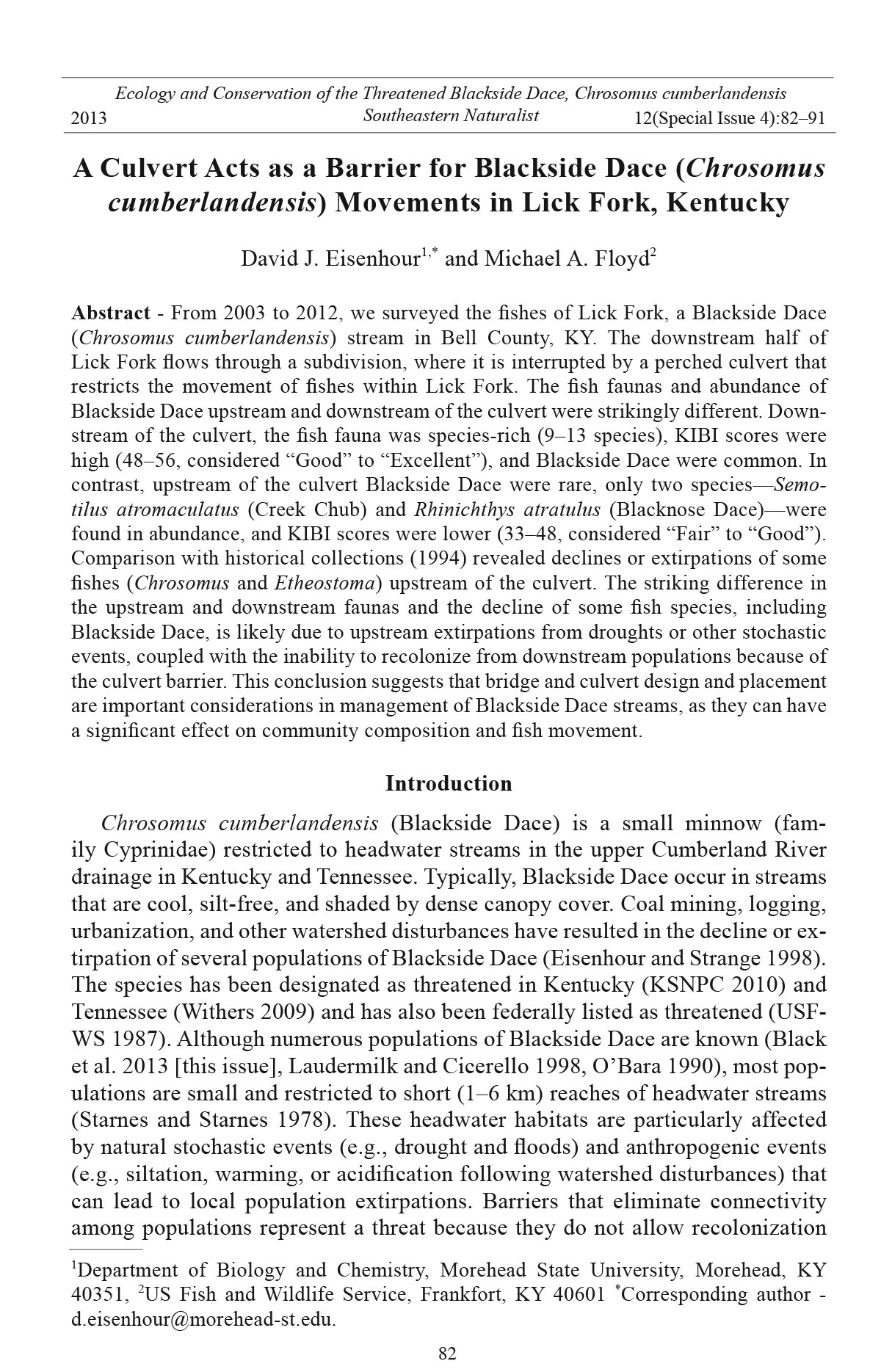 Abstract - From 2003 to 2012, we surveyed the fishes of Lick Fork, a Blackside Dace