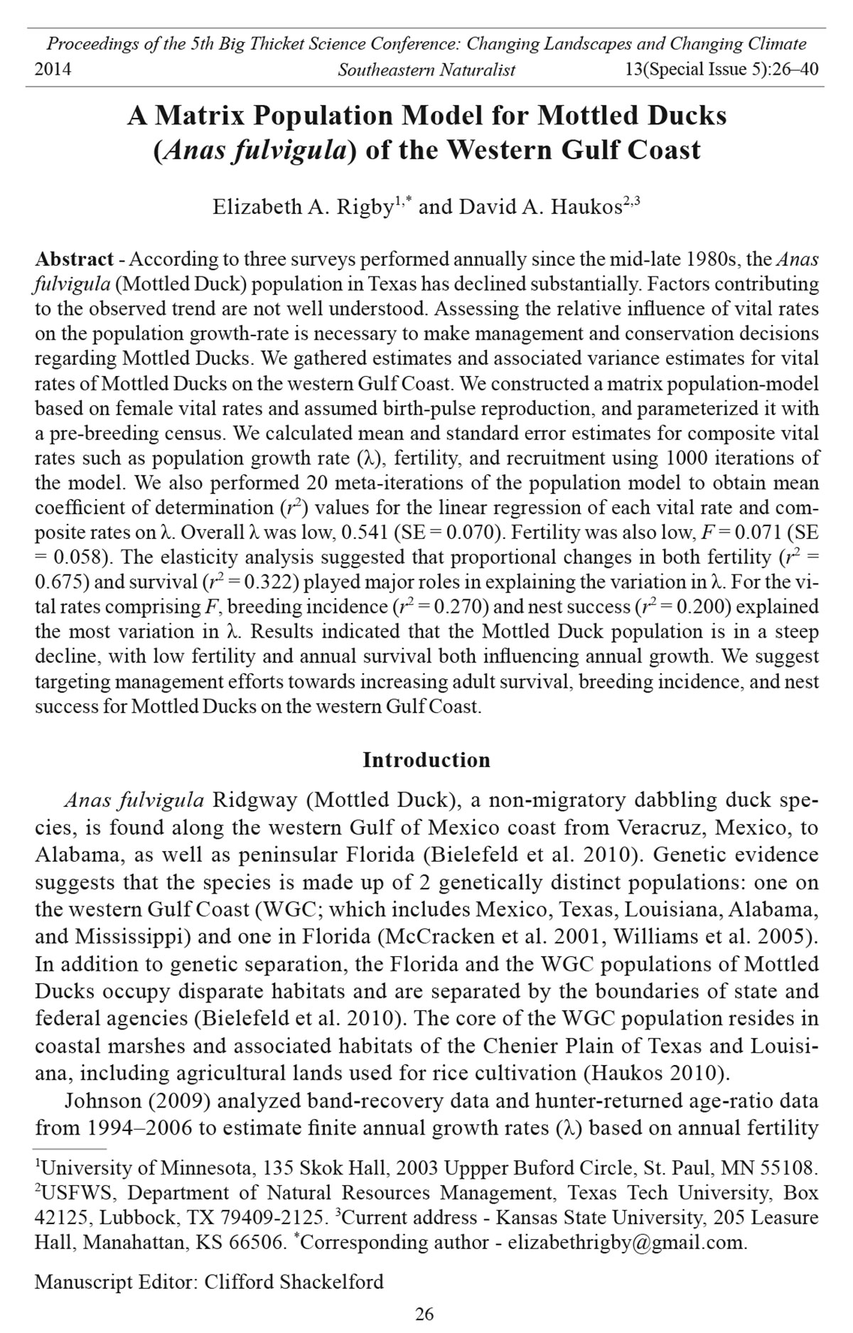 Johnson, F.A. 2009. Variation in population growth rates of Mottled Ducks in Texas and