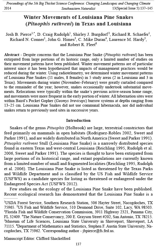 Abstract - Despite concerns that the Louisiana Pine Snake (Pituophis ruthveni) has been