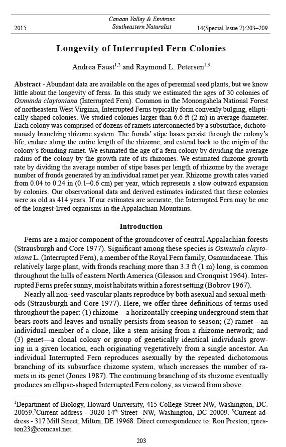 Jones (1987) suggested that Interrupted Fern colonies are long lived. Further,