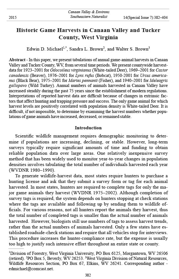 Historic Game Harvests in Canaan Valley and Tucker