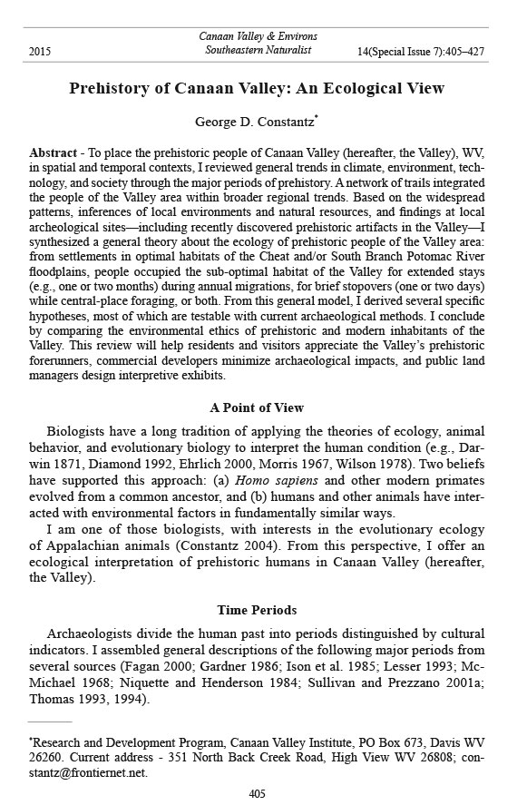 ecological interpretation of prehistoric humans in Canaan Valley (hereafter,