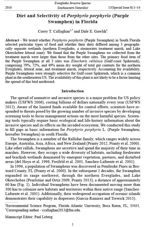 Florida by (1) quantifying the diet of Swamphens, (2) determining the selectivity