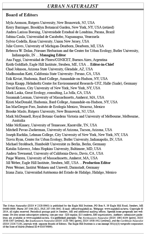 Board of Editors and Indicia of the Urban Naturalist, Number 2, 2014
