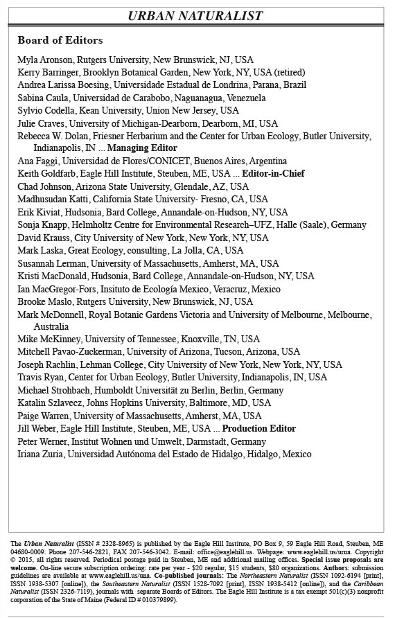 Board of Editors and Indicia of the Urban Naturalist, Number 5, 2015