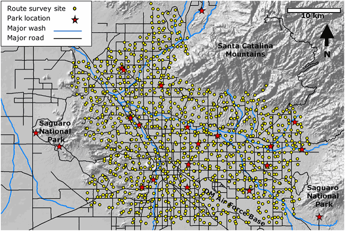 In 2001, 661 randomly located sites on 63 routes in the Tucson area were surveyed (Tucson Bird Count, n.d.). With the exception of sites that have been relocated due to changes in accessibility or other disruptive factors, site locations are permanent, allowing for the same sites to be surveyed each year. Tucson has grown by more than 30 square miles since 2000 (City of Tucson, 2005), and additional sites have been added to the Route Program in newly developing areas around the edges of the city. In 2005, 772 sites on 72 routes were surveyed (Tucson Bird Count, n.d.; yellow dots in Figure 1). Due to the volunteer-based nature of the TBC and the fact that participants select the routes they want to survey, there is no guarantee that all routes will be adopted every year. As a result, each year a few routes are not surveyed. To avoid gaps in coverage, routes that were not surveyed one year are given priority the following year, or are surveyed by TBC staff.