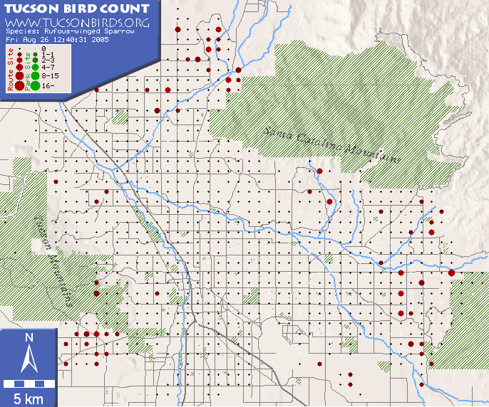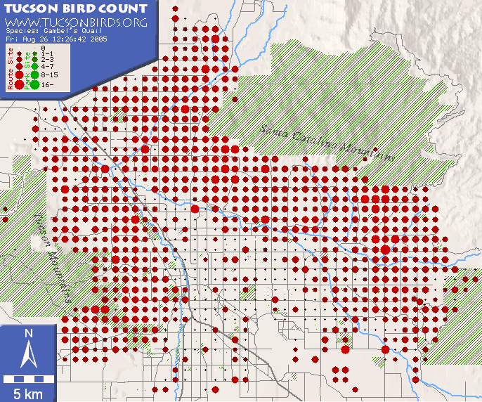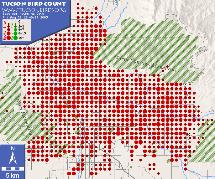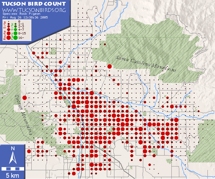 Data collected by citizen scientists through the TBC has enabled the generation of detailed Tucson-area distribution maps for more than 200 bird species. These maps indicate that many species follow distinct distribution patterns in Tucson. A group of native desert birds, exemplified by Gambel's quail (Callipepla gambelii), have similar distributions, with relatively high numbers of individuals on the less developed edges of Tucson, but few individuals occupying the city's more urbanized center (Turner, 2003; Figure 2). Rock pigeons (Columba livia), on the other hand, are among a group of species that exhibit the inverse pattern, reaching their highest abundances toward Tucson's urban core (Figure 3). Other distribution patterns are apparent in the data, including the restriction of some species to riparian areas and the concentration of others in areas of relatively dense native woodlands (Turner, 2003). Some bird species, such as mourning doves (Zenaida macroura), Gila woodpeckers (Melanerpes uropygialis), and house finches (Carpodacus mexicanus) have been counted in relatively high numbers at almost every survey point (Figure 4). Yet species more sensitive to development, such as the rufous-winged sparrow (Aimophila carpalis), are found in relatively small numbers and only at the very edges of the city (Figure 5).