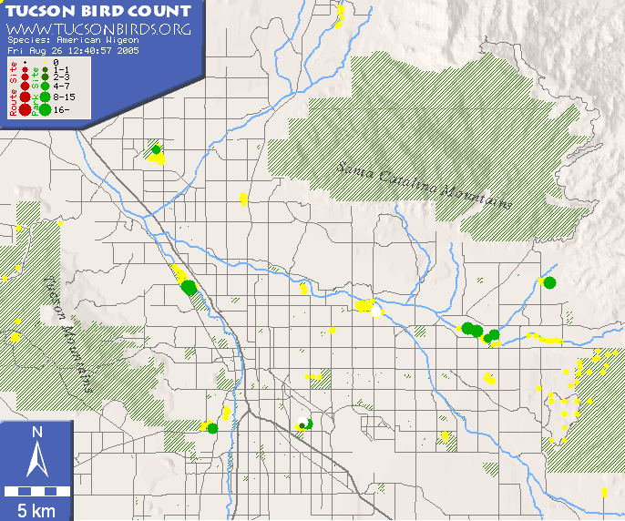 Since the initiation of the TBC in 2001, participants have recorded more than 164,000 birds representing 212 species. A total of 158 species have been recorded through the Route Program, and a total of 202 species have been recorded through the Park Monitoring Program. Fifty-four species observed through the Park Monitoring Program have not been counted through the Route Program. This difference is largely attributable to two factors. First, Tucson has a semiarid climate, and wetlands are relatively rare among the randomly located sites in the Route Program; however, several of the locations monitored in the Park Monitoring Program contain ponds, lakes, or rivers. As a result, many water-associated species, such as the American wigeon (Anas americana), have only been observed at park locations (Figure 6). Second, the more intensive nature of the Park Monitoring Program, with its quarterly monitoring and multiple sites per bird-rich location, has resulted in sightings of several less common species, such as the golden eagle (Aquila chrysaetos), Lewis's woodpecker (Melanerpes lewis), and Hammond's flycatcher (Empidonax hammondii), not found in the Route Program.