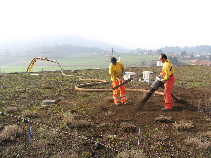 Project workers add compost substrate (about 4 cm) to the topsoil of the roof at Shoppyland, Bern. (Photo by N. Baumann)