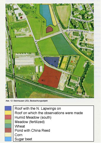 Figure 3: Arial photo of the surroundings at the Steinhausen site, Canton Zoug, with habitat use of northern lapwings (Vanellus vanellus) mapped on. (Photo by L. Jensen and A. Kaufmann—© search.ch/Endoxon AG, TeleAtlas)