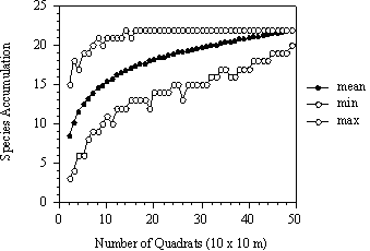 The middle curve of the species-area curve shows the mean number of species per plot. The mean markedly increases and does not level off at quadrat 50, suggesting that censusing a larger area would reveal more taxa (Figure 4). The lower and upper curves are the minimum and maximum number of species found in the randomization of the quadrats, respectively. The maximum values on the curve level off at quadrat 15; it can be inferred from this that a maximum number of species (22 taxa) would be found in 15 quadrats.