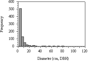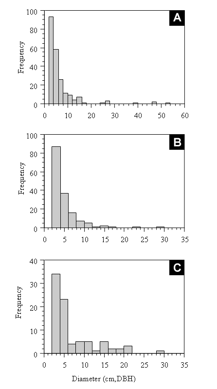 The use of lower and upper quartiles (or the 25 percentile) of the sampled population statistically partitioned all arborescent stems into small- and large-size diameter classes and a central 50-percentile for the midsize-diameter class. The diameter-size classes were as follows: small-size diameters (2.0 to < 2.8 cm DBH, n = 202); midsize diameters (2.8 to < 7.48 cm DBH, n=372); and large-size diameters (7.48 to 116.7 cm DBH, n=197).