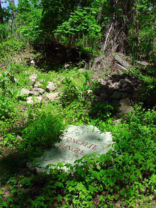 Since the Conservancy began in 2001, volunteers have removed multiple Dumpster loads of debris, including automotive parts, construction materials, and discarded household appliances, from the site using only hand tools. The remaining fill is too heavy to lift or is located in inaccessible areas. Some concrete debris has been recycled into artworks by artist Ariane Burgess, who led volunteers in the creation of a Peace Labyrinth built from blocks of concrete found on site (Figure 2), and artist Lynne Hull, who created concrete "Migration Mileposts" (Figure 3) that celebrate the birds (documented by DNA or radio telemetry) that pass through the site when migrating along the Atlantic Flyway. Teaneck artist Richard K. Mills's "Concrete Jungle" lies among other huge slabs of concrete roadway next to Dragonfly Pond, an open water area (Figure 4).