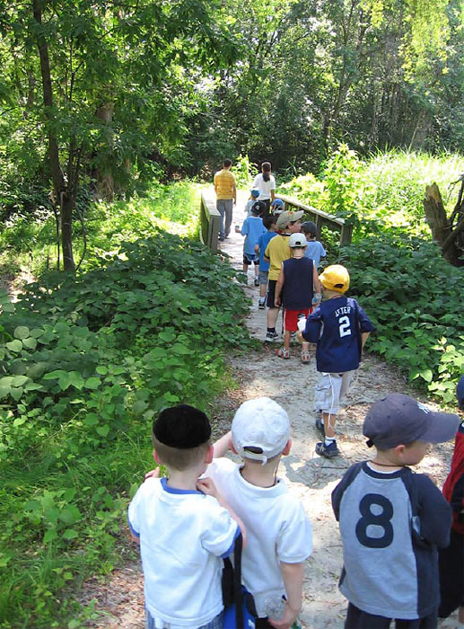 Local schoolchildren visit Teaneck Creek and walk through the Conservancy site on the newly built trail system, July 2006.
