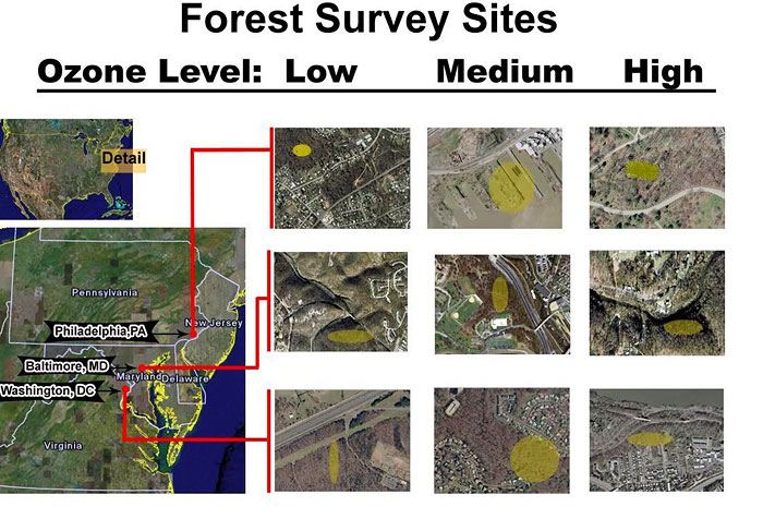 Within each city, UVA scientists chose three separate sites on the basis of their relative annual concentration of ground-level ozone, with thresholds set at: low (0–79 ppb), medium (80–99 ppb), and high (100–125+ ppb)1. In determining these concentration thresholds, the scientists assumed that the low levels would not injure plants, medium levels would injure only ozone-sensitive plants, and high levels would harm all but the most ozone-tolerant plants. They also assumed that high pollution levels would selectively eliminate pollution-intolerant species while augmenting establishment of pollution-tolerant species; and that forests in low-pollution areas would not have experienced this disturbance and would therefore retain native intolerant species, thus reducing the number of invasive plants that were able to establish there (Tillman 1994).