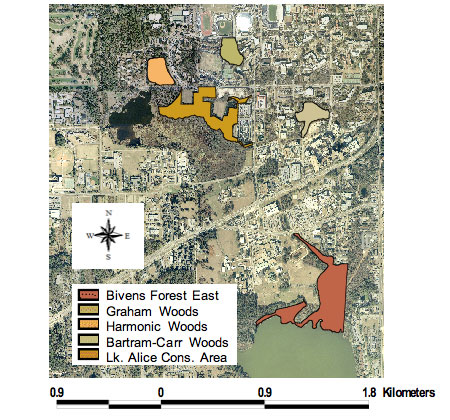We focused our study on five forest remnants on the University of Florida campus, located in Gainesville, Florida: Harmonic Woods (3.7 hectares); Graham Woods (3.0 hectares); Bartram-Carr Woods (3.5 hectares); Lake Alice Conservation Area (11.3 hectares); and Bivens Forest (16.6 hectares) (Figure 1). The University of Florida Gainesville campus is located in north-central peninsular Florida, where summers are hot, humid, and generally rainy. Two of the three smallest remnants, Harmonic Woods and Bartram-Carr Woods, consist mainly of upland mixed pine-hardwood forest, and both contain or are immediately adjacent to small streams or low-lying areas. The third small patch, Graham Woods, is made up of a mixture of bottomland hardwoods and upland mixed pine-hardwoods, and encloses a small network of seasonally fluctuating but permanent streams. One of the two largest remnants, Lake Alice Conservation Area, contains upland mixed pine-hardwood forest and some regenerating clear-cut habitat, and has some flood-plain forest created by a large marsh (25 hectares) adjacent to the remnant. The other large remnant, Bivens Forest, consists of an interior bottomland-hardwood swamp ringed by mixed pine-hardwood forest on three of its four edges. Its fourth edge is adjacent to a lake. All remnants except Harmonic Woods are subject to occasional flooding.