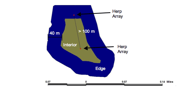 Figure 2: Illustration of edge and interior locations of herpetofaunal sampling arrays within forest remnants in Gainesville, Florida. An edge array was placed within 20 to 40 meters of the boundary of a remnant, and an interior array was situated more than 40 meters from a remnant boundary. Arrays were positioned at least 100 meters apart to maintain independence from each other.
