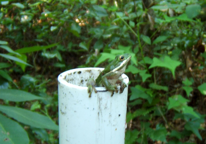 We constructed PVC pipe refugia to attract various species of tree frogs. We used pipes of both 2.5 centimeter and 5 centimeter diameter-widths, with lengths of about 76 centimeters, driving them into the ground to depths that allowed the pipes to stand up on their own (Zacharow et al. 2003). We placed one pipe of each diameter width between each wing of the Y-shaped fence array (Moseley et al. 2003), resulting in six total PVC pipes per sampling array.