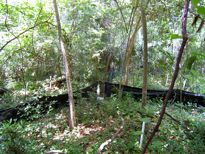 We sampled herpetofauna from May to August during the summers of 2005 and 2006, using drift fence arrays with pitfall traps and funnel traps, along with polyvinyl chloride (PVC) pipe refugia to sample for tree frogs. We made drift fences out of approximately 30-centimeter-wide silt fencing (Enge 1997). For funnel traps, we modified the format described by Enge (1997), using aluminum window screening approximately 76 centimeters in length to build cylindrical traps of the same length with a funnel in one end and with the other end closed. Following a modification of a design by Moseley et al. (2003), we formed arrays in the shape of a Y, with three 7.6-meter-long drift fence wings conjoined around a single pitfall trap and placed at 120-degree angles to each other. We placed funnel traps at the distal ends of each wing, making sure the open funnels were flush to the ground and equally straddling the ends of the fences (Johnson, personal communication).