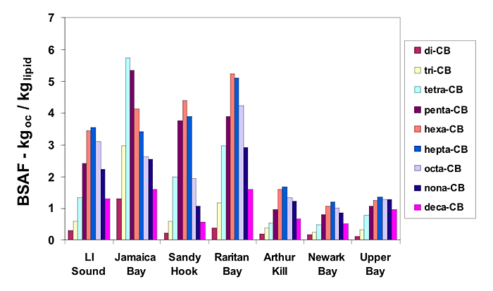 Regarding this bioaccumulation, we specifically observed (1) a variation in BSAFs for PCB homologs as a function of KOW, and (2) significant differences in BSAFs for discrete locations within the Inner (i.e., Arthur Kill, Newark Bay, and Upper Bay) and Outer (i.e., Long Island Sound, Jamaica Bay, and Sandy Hook) Harbor. These homolog and spatial patterns are shown in Figure 3. Given the serious implications this observed difference in BSAFs could have for setting sediment cleanup targets based on desired dredged material endpoints, we evaluated possible reasons for the spatial differences using a mechanistic steady-state bioaccumulation model and bioenergetic parameters from the literature.