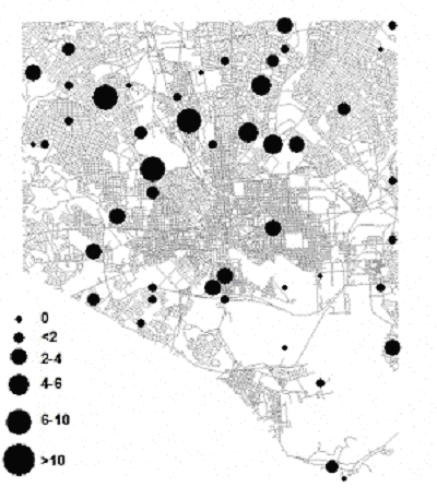 Figure 1: Variation in abundance of rock pigeon at bird census points in Baltimore. Sizes of circles represent the mean number of individuals detected over three point counts, May through June 2002.