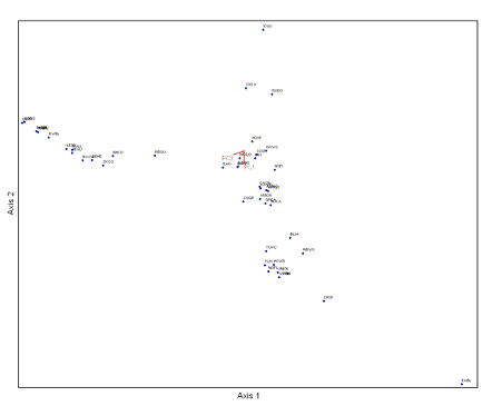 Figure 2: Results of canonical correspondence analysis (CCA) using bird species abundance values and scores for the first three vegetation principal components. Species that occur together on bird census points are grouped together in the figure. Principal component 1 and principal component 3 were correlated with the ordination axes.
