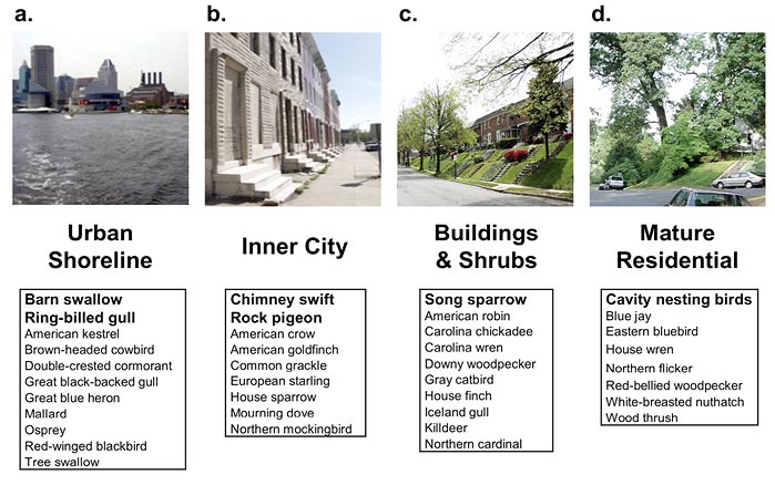 One goal of this one-year exploratory study was to understand patterns of bird species composition and abundance in the day-to-day settings where most Baltimore residents encounter birds. We designed our study to answer questions about bird species composition and abundance and about the ability of variables that describe features of neighborhoods to serve as correlates of species richness and species abundance. The answers to the questions were used in designing a bird-monitoring project that started in 2005. Our analyses reveal clustering of birds into different urban bird communities, and they identify several potentially important habitat and land-use/land-cover associations that will be used to guide long-term bird monitoring in Baltimore (Table 3, Figure 4).